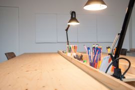 Einrichtungen: Im 5. Stock des Gebäudes befindet sich der Meeting Raum «Jolle». Mit Sicht auf den Rhein Hafen und Container lädt Kleinhafen zu arbeitsintensiven Stunden ein.