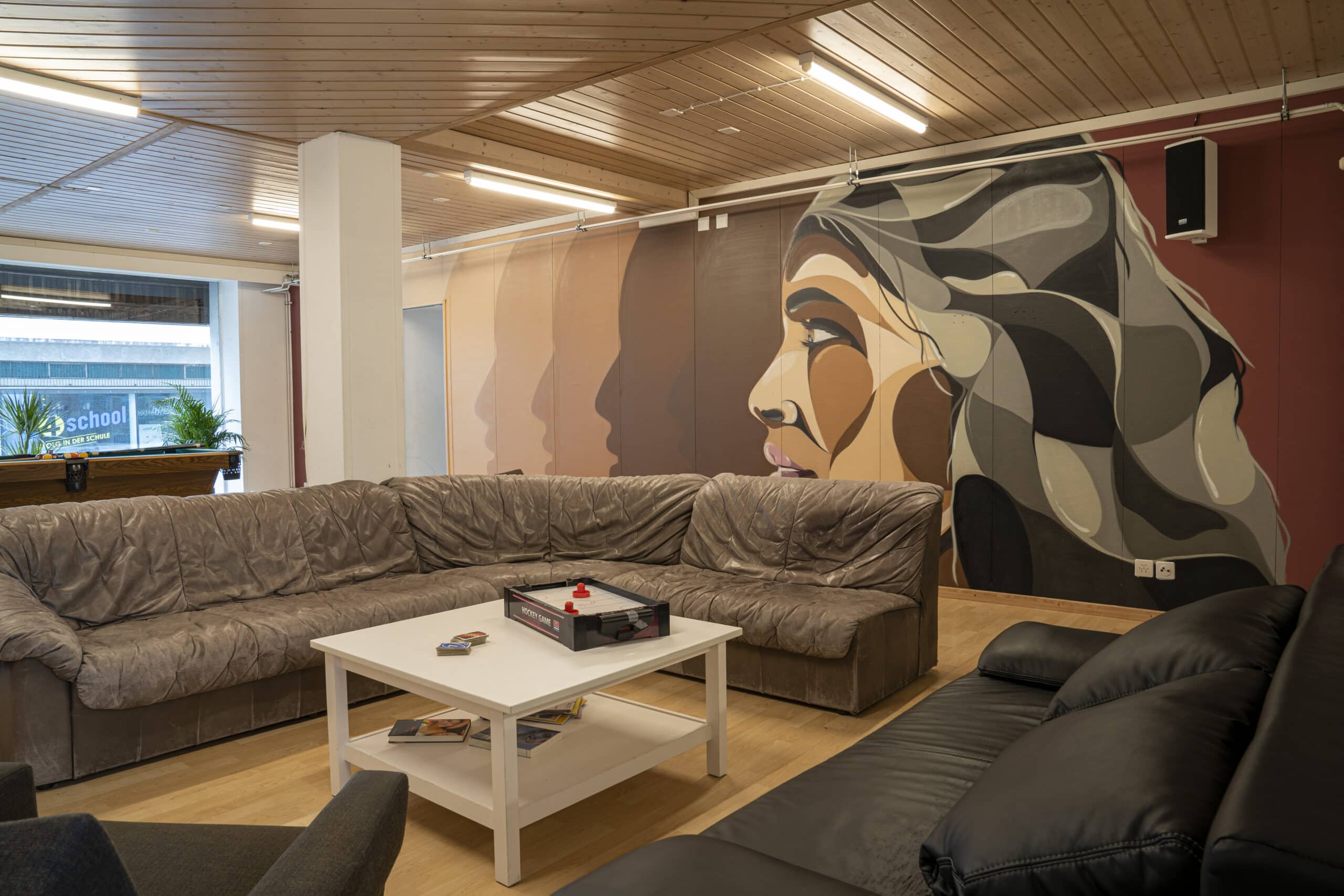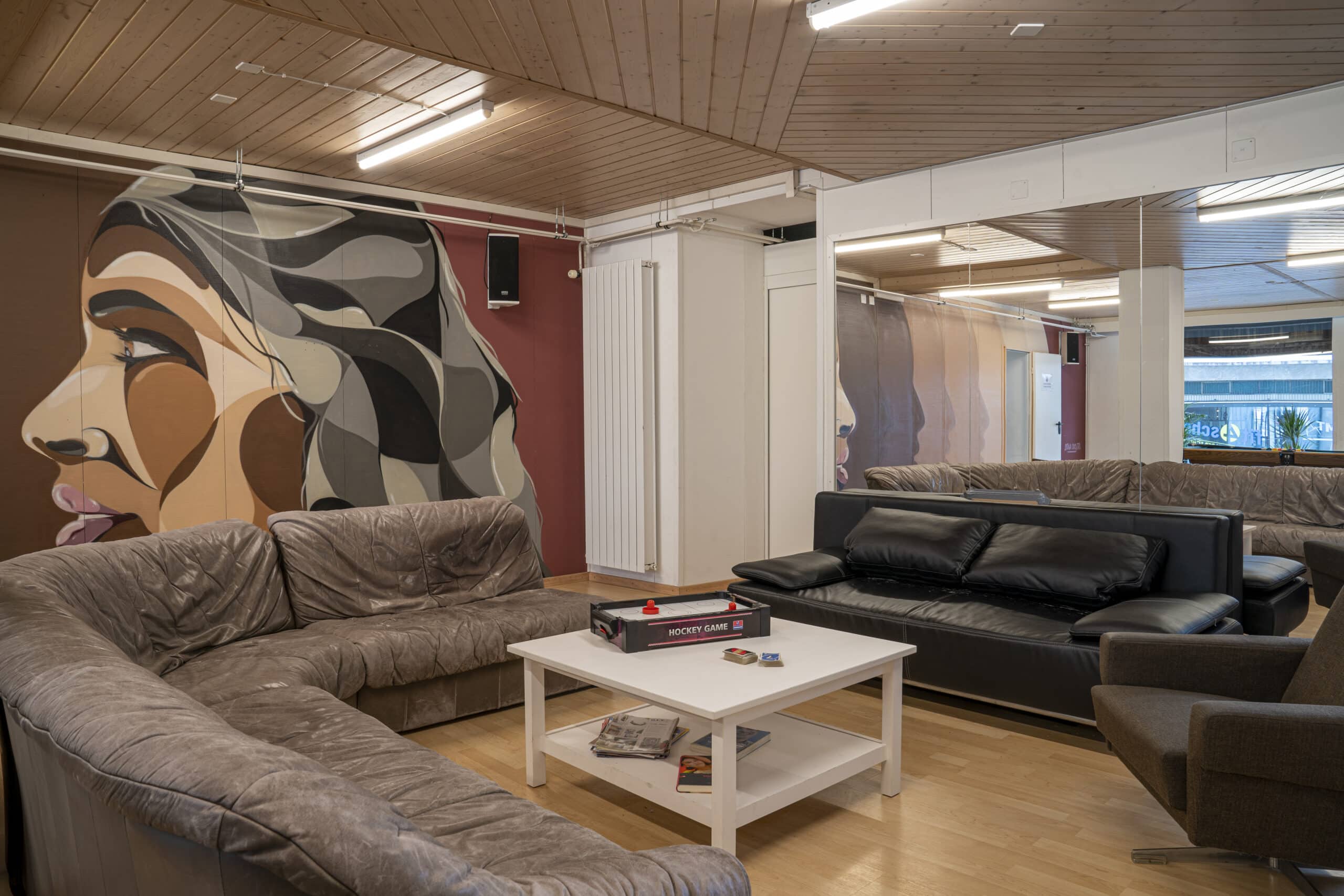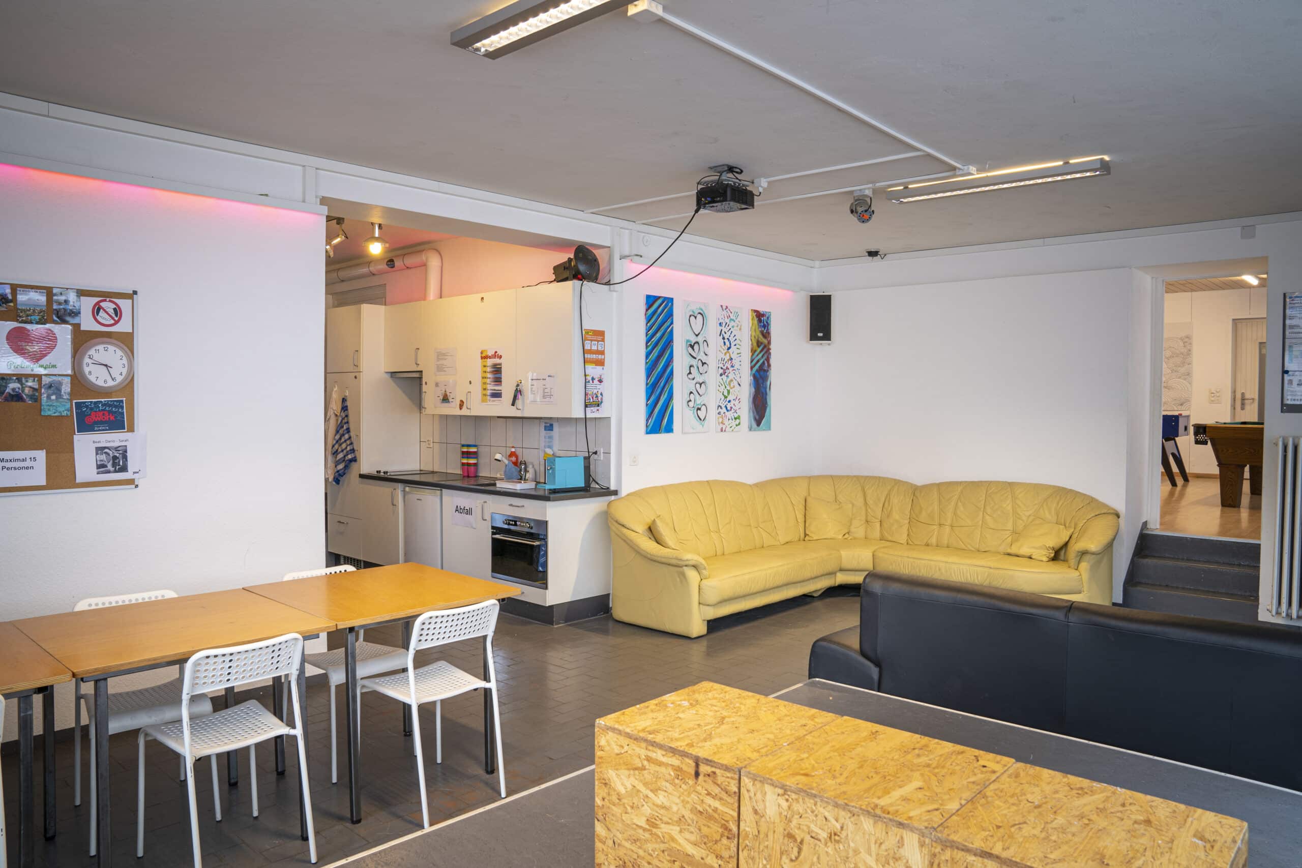 Einrichtungen: Der Raum ist zweigeteilt, in einen Aufenthalts- und einen Spielraum. An dem Aufenthaltsraum ist eine Kleinküche angeschlossen. Beide Räume bieten bequeme Sitzgelegenheiten.