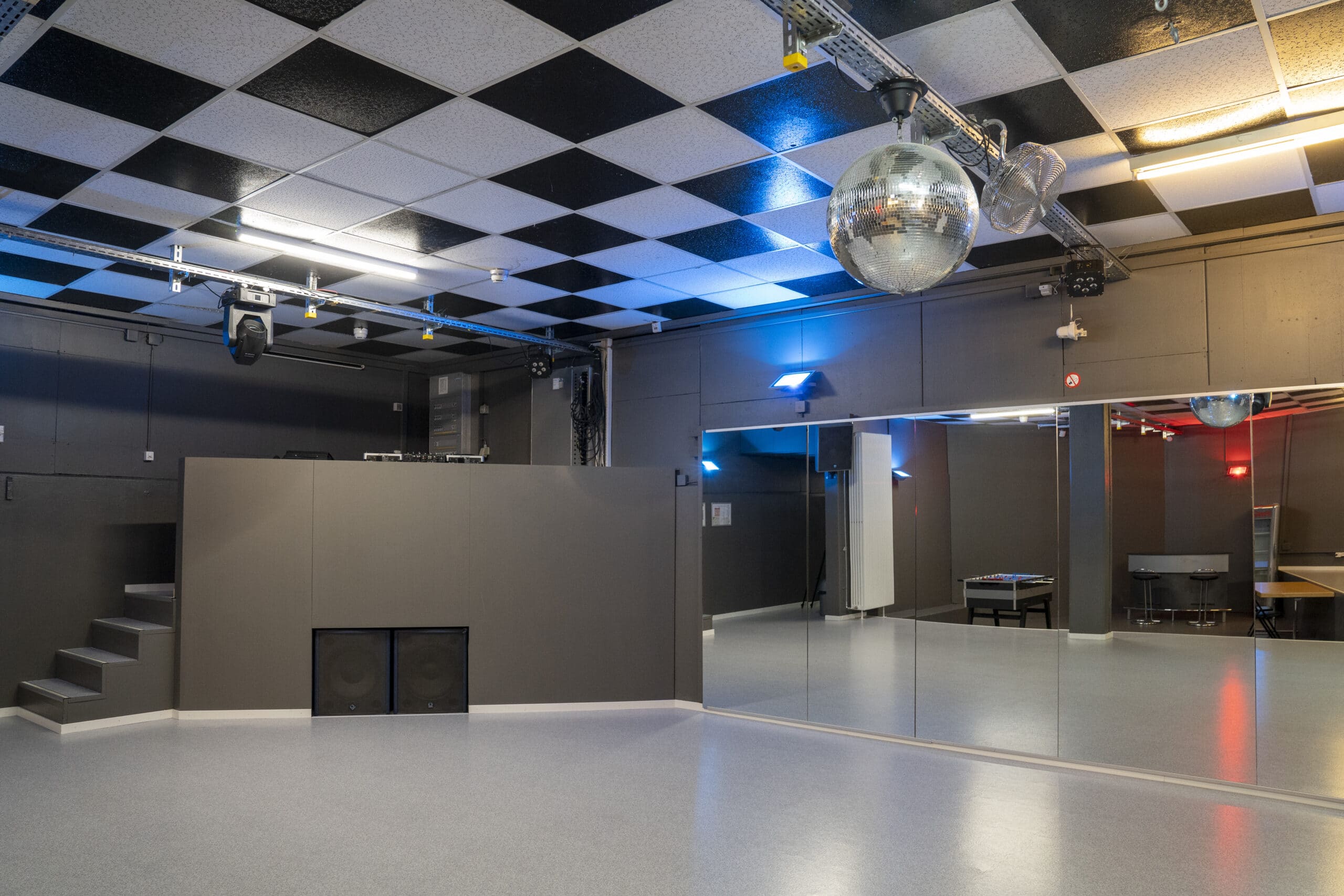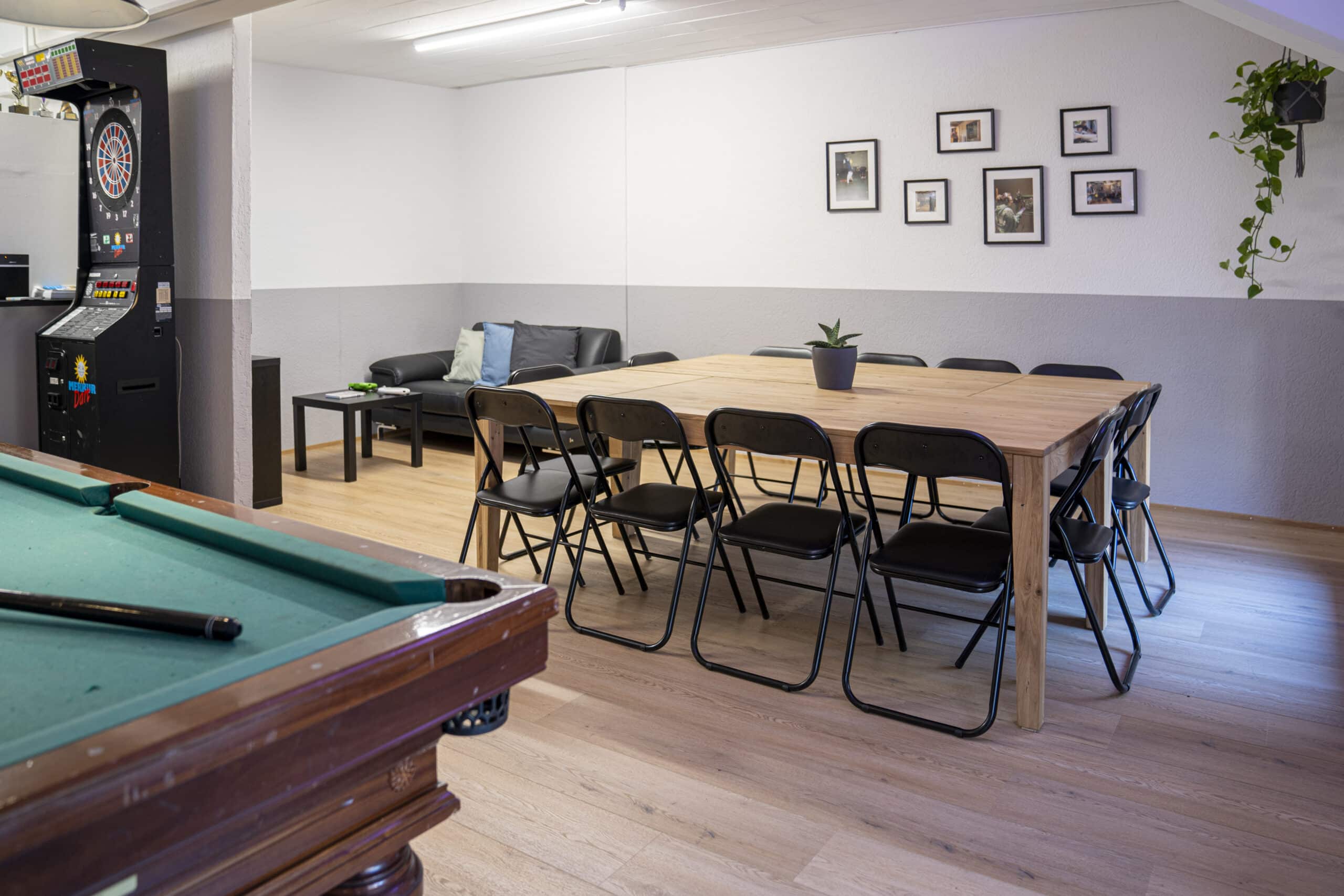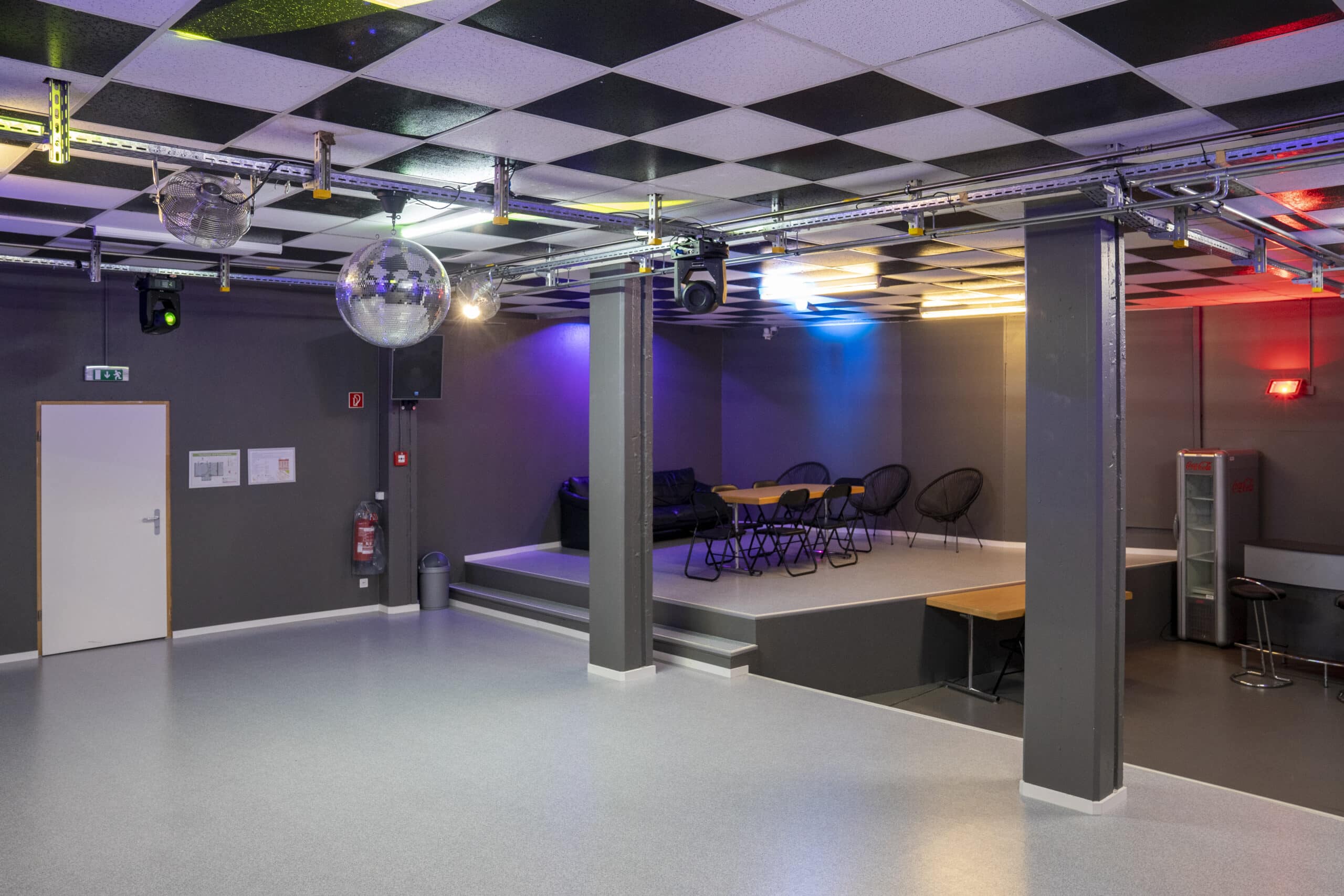 Einrichtungen: Wir bieten verschiedene Räumlichkeiten mit diversen Nutzungsmöglichkeiten: Discoraum im EG mit Licht-, Musikanlage und Bar für unterschiedliche Veranstaltungen (Partys, Ausstellungen, Apéros etc.). Raum zur Allee im EG mit Aussenbereich, Bar, Feuerschale und Spielmöglichkeiten (Ausstellungen, Apéros, Geburtstagsfeiern etc.). Multifunktionaler Veranstaltungsraum im OG mit Küche, Bar, Sitz- und Spielmöglichkeiten (Workshops, Sitzungen, Geburtstagsfeiern etc.).